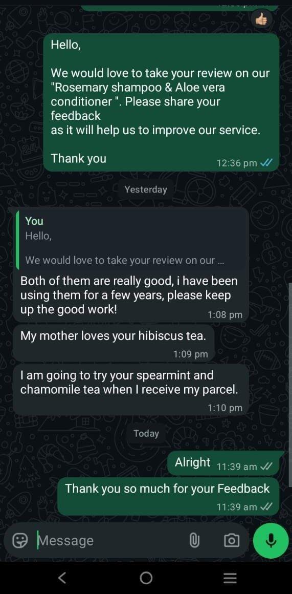 I’ve been using your products Rosemary shampoo and Aloe vera conditioner for a few years now, and they’re really good. Please keep up the great work! 💚